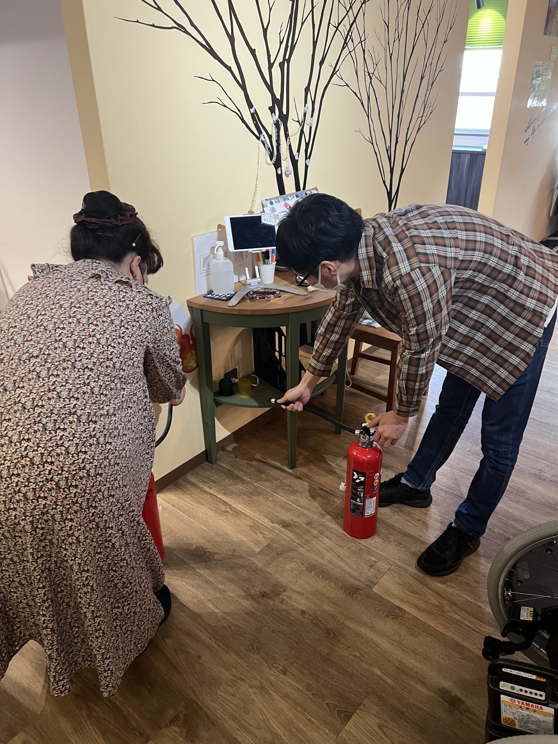 消火や窓閉め、換気扇を止めたりする利用者さんにそれぞれ職員がつきながら細かな指示出しを行い、